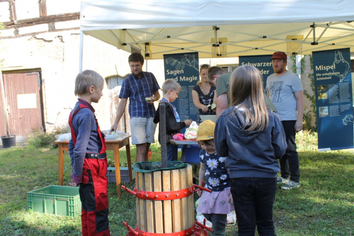 Veranstaltet man einen Tag des Streuobstes ohne Obst? Diese Frage haben wir uns seit den späten Frösten im Frühjahr oft gestellt. Über den Ausfall durch das Absterben der Obstblüten wurde sachsenweit berichtet. Die Verluste sind regional sehr unterschiedlich, geringere Erträge im Elbland bis Totalverlust in der Lausitz. Teilweise gibt es große Unterschiede innerhalb weniger Kilometer. Auch rund um Heynitz gab es sehr wenig Streuobst zu ernten. Trotzdem konnten wir durch die großzügige Unterstützung des Klosterparks Altzella genügend Obst für die Apfelausstellung und das Saftpressen sammeln. Die Bäume wurden durch die dicken Klostermauern ausreichend vor den Frösten geschützt. Die Mönche hätte es gefreut.