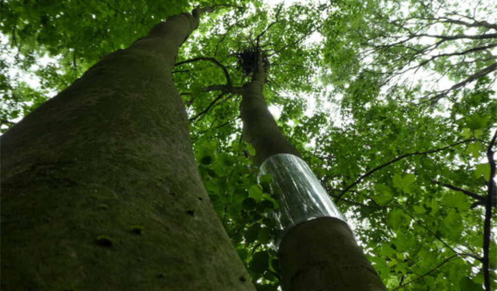 Im Jahr 2018 haben wir begonnen, eine Auswahl bekannter Nestbäume von Greifvögeln mit Manschetten zu versehen. Damit ist beabsichtigt, die zum Brüten genutzten Bäume und letztlich die Nester der Greifvögel vor dem Zugriff kletternder Prädatoren zu schützen. Vor allem Waschbär, Baum- und Steinmarder sind imstande, Gelege oder Jungvögel in den Nestern zu erreichen und damit Brutverluste zu verursachen. Hinter der praktischen Maßnahme der Prädatorenabwehr steht der Gedanke, ein gewisses Gegengewicht zu den anhaltenden und regelmäßigen Greifvogelverlusten, hervorgerufen z. B. durch Kollisionen an Straßen und an Windenergieanlagen, zu schaffen. An regelmäßig benutzten Nestbäumen, das betrifft etwa die Hälfte der kartierten Standorte, kommen unsere Manschetten wiederkehrend zum Einsatz. Ein anderer Teil der Abweiser muss in jedem Jahr neu an erstmalig besetzte Brutbäume montiert werden. Bei den Manschetten handelt es sich um Glasfolien, welche um die Bäume gelegt und mit robustem Klebeband verschlossen werden. Die Bäume selbst werden dabei nicht verletzt. Das Unternehmen *SachsenEnergie AG* ist bei der Umsetzung einer unserer Partner.